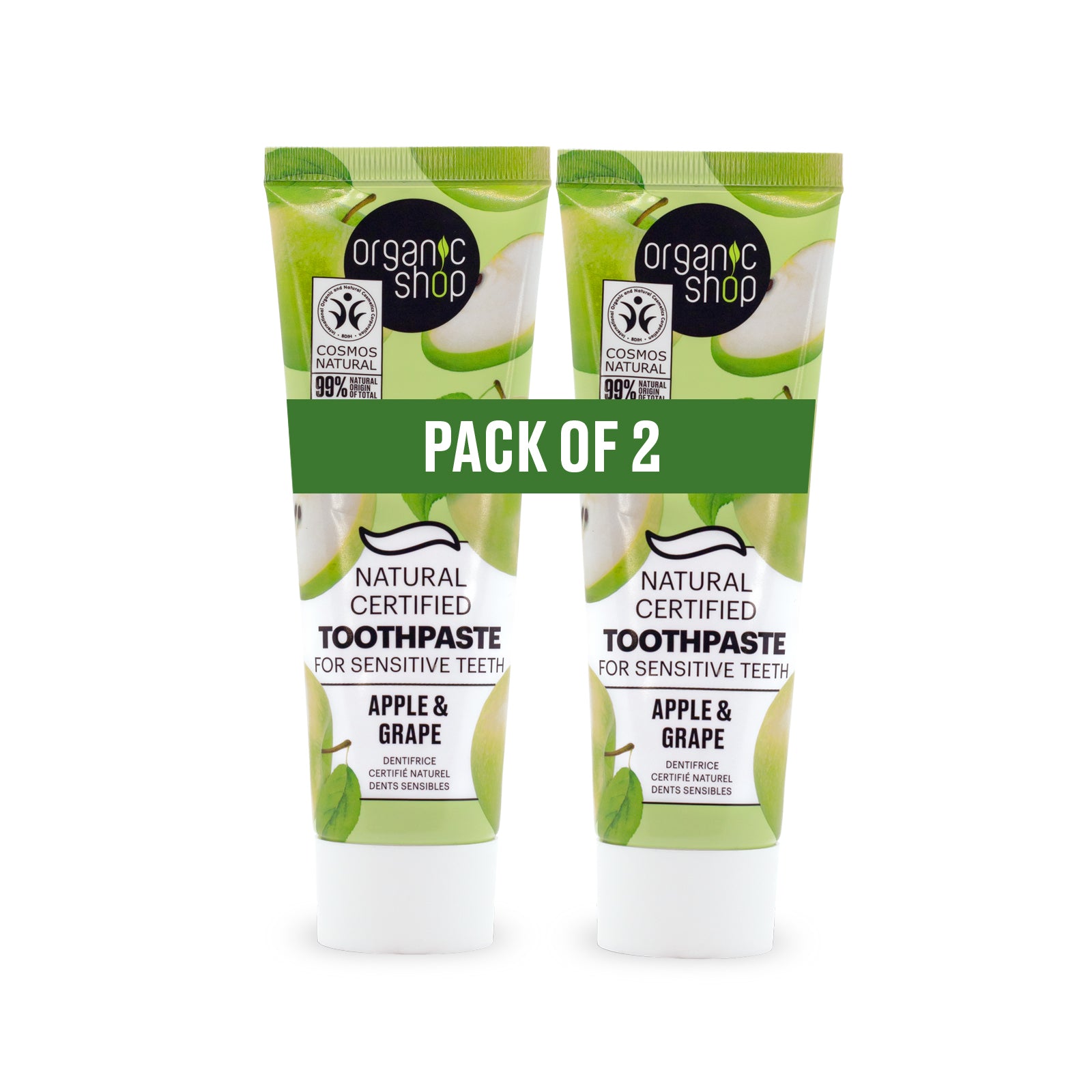 Organic Shop Apple & Grape Toothpaste, Fluoride-Free, Vegan, Natural, Sensitive Teeth, Gum Care, Cavity Protection, Pack of 2, 99% Natural