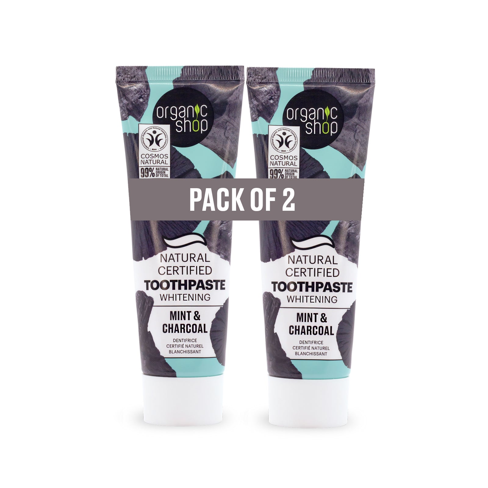 Organic Shop Mint & Charcoal Whitening Toothpaste, Fluoride-Free, Vegan, Natural, Pack of 2, Fresh Breath, Gentle Clean, COSMOS Certified